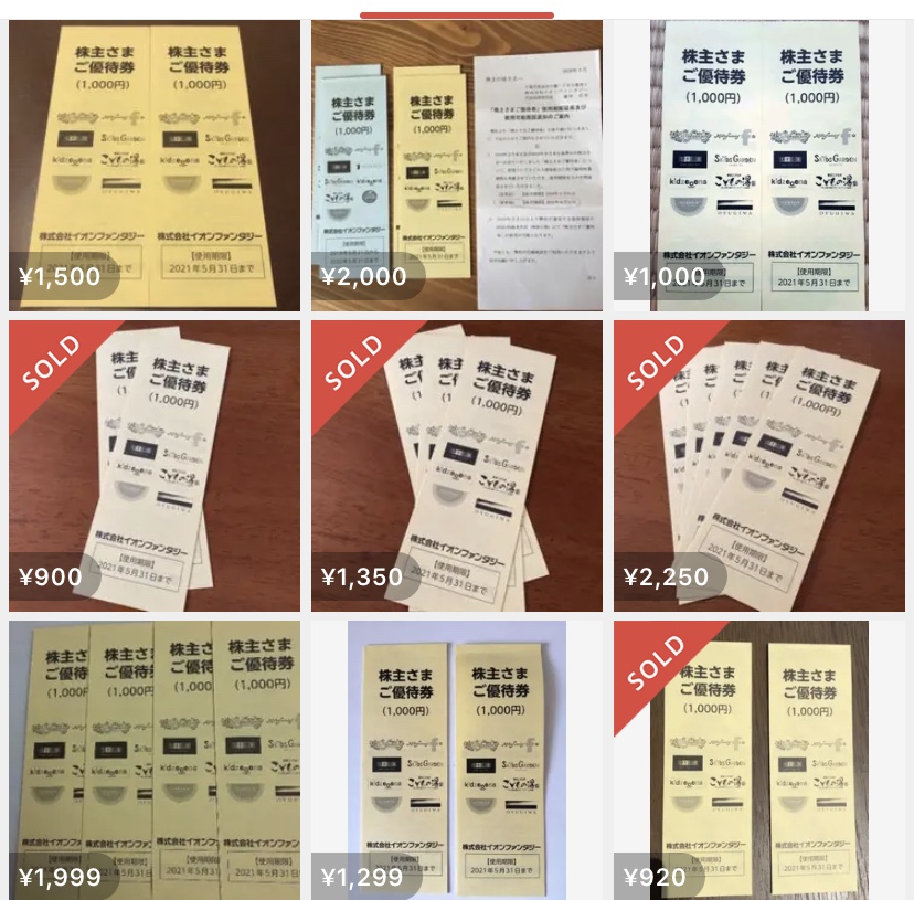 コロナ以前は2,000円分が1,300円程で取引されていたイオンファンタジーの株主優待券ですが現在(2020年5月26日)は900円でも売れていない状態となります。