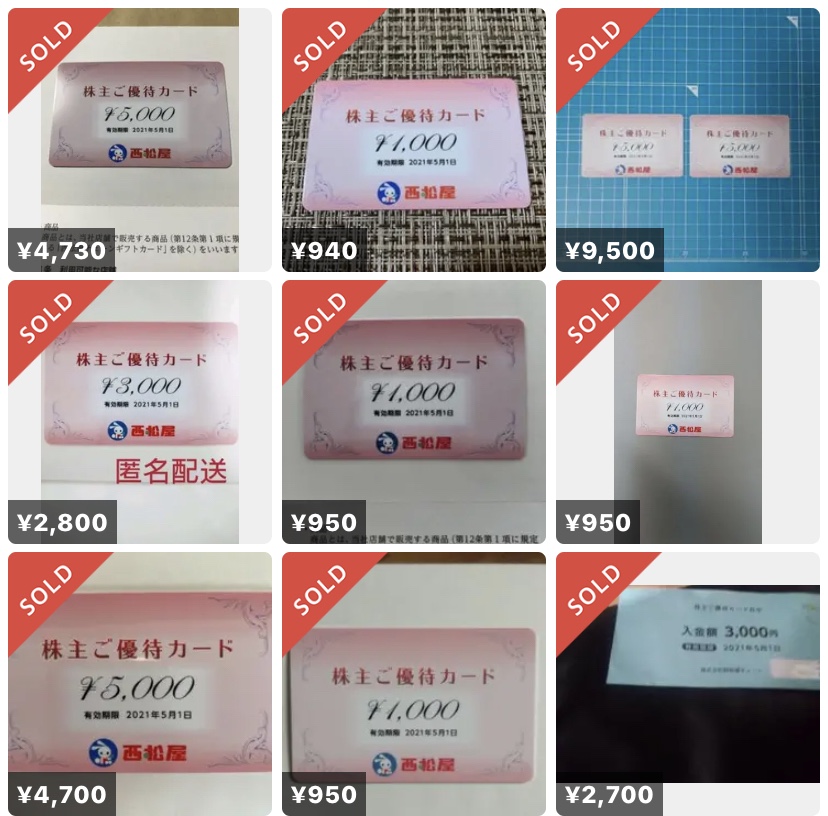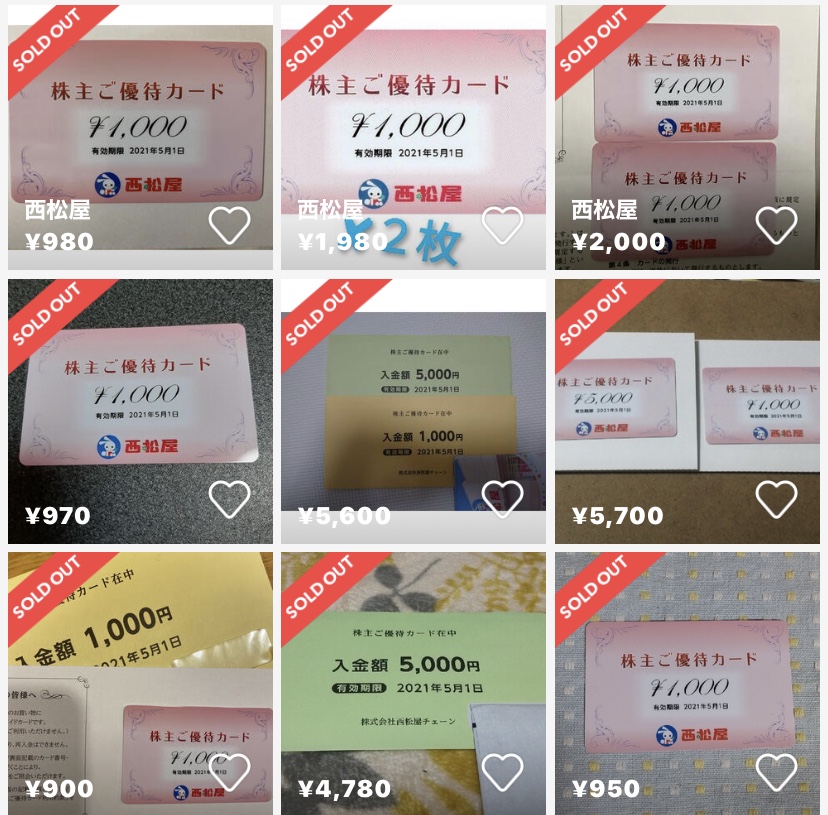 西松屋の株主優待券はヤフオク、メルカリ、ラクマで取引されている。