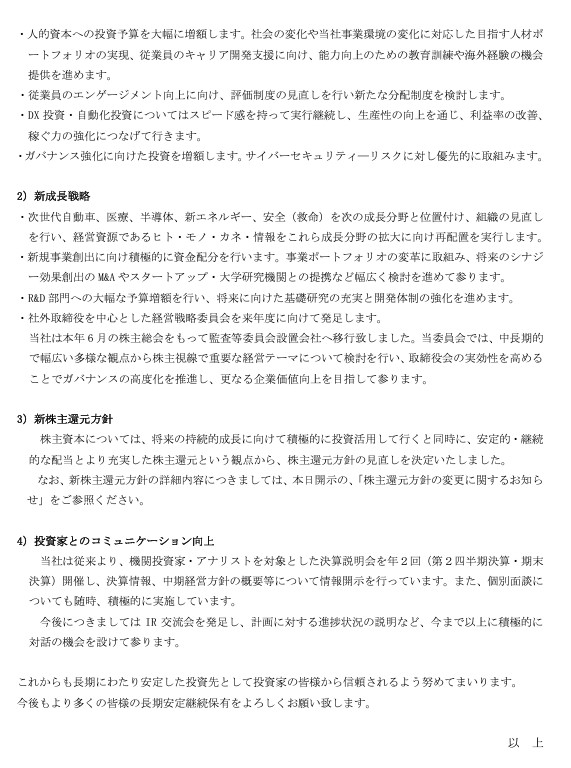 DOE4.0%以上、年間45円を下限と魅力的な内容ですね。DOEは株主資本を基準として配当を決定することから単年度の業績が悪くても予め株主資本から想定した配当額から大きく減額するリスクが少なく、安定配当が期待できます。個人的には配当性向を基準にしている企業は利益で大きく上下し安定に掛けることからDOEを採用している企業の方が投資しやすいと思います。
