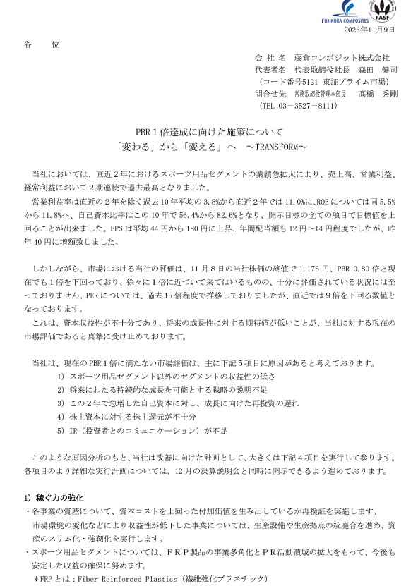 藤倉コンポジットが発表したPBR1倍達成に向けた施策